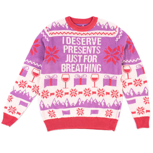 The phrase "I deserve presents just for breathing" originates from Lisa Barlow, a cast member of The Real Housewives of Salt Lake City (RHOSLC). Known for her sharp wit and memorable one-liners, Lisa delivered this line during the show's second season, encapsulating her unapologetic confidence and flair for dramatic humor. The quote quickly resonated with fans and became a viral catchphrase, symbolizing a tongue-in-cheek attitude of self-worth and entitlement. Its popularity led to a surge in themed merchandise, including mugs, ornaments, and apparel, often featuring Lisa's likeness or stylized text of the quote. For instance, products like the "I Deserve Presents Just For Breathing" mug have become popular gifts among Bravo enthusiasts. Bravo wanted to create a Christmas sweater with that phrase to add to their swag collection.