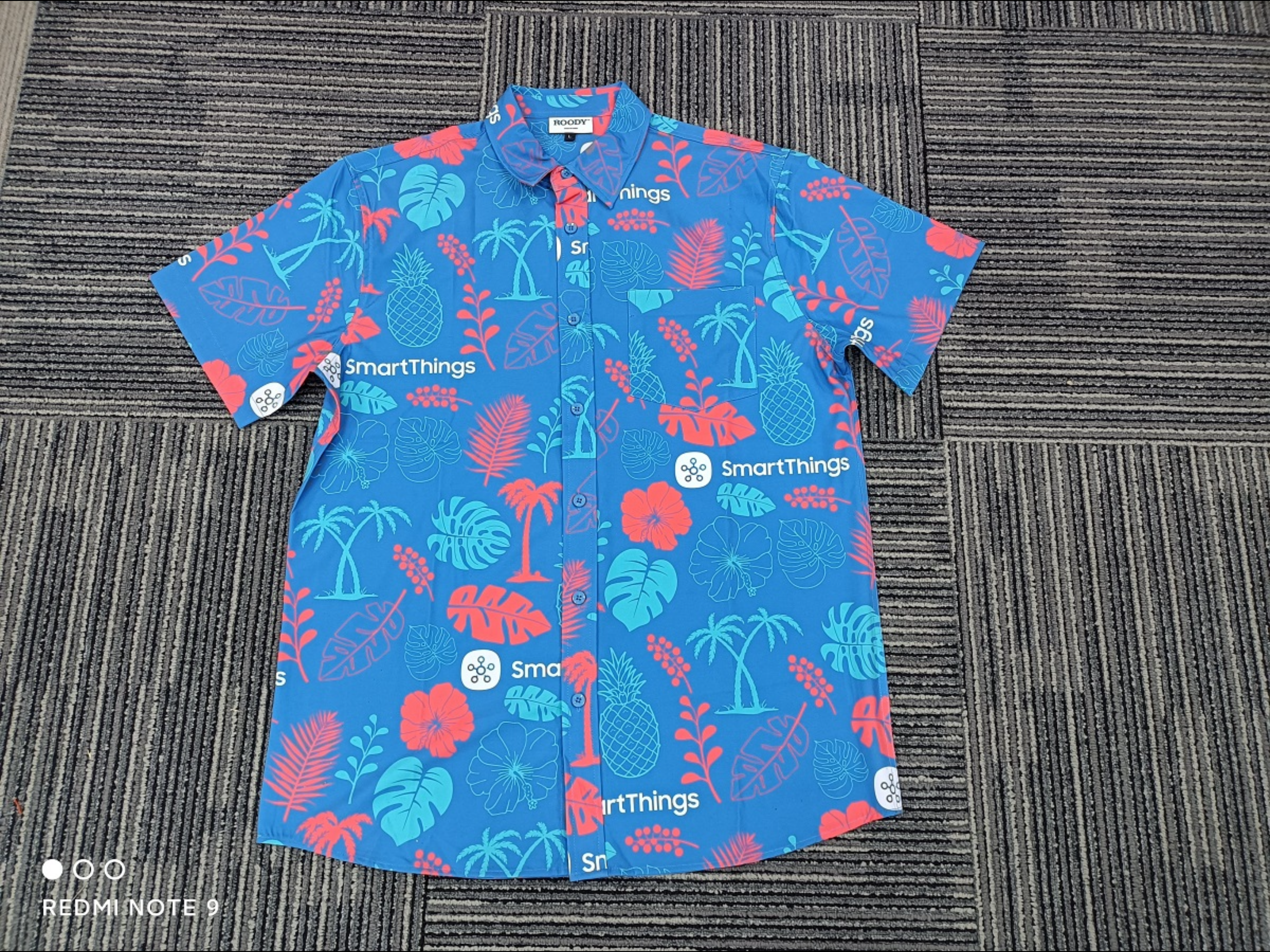 The custom Hawaiian Shirt for SmartThings was a fully custom shirt which means that a design is not just printed on a pre existing shirt. Rolls of fabric are custom made and then cut and sewn based on the sizes required. Custom labels are available or the Roody label can be used - the Roody label signifies that the shirt is a sustainable one. The fabric used is 100% recycled polyester and for every shirt made, one tree is planted!