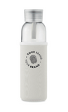Recycled glass bottle with neoprene pouch and PP lid with silicone hanger.