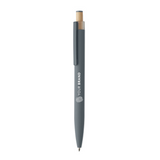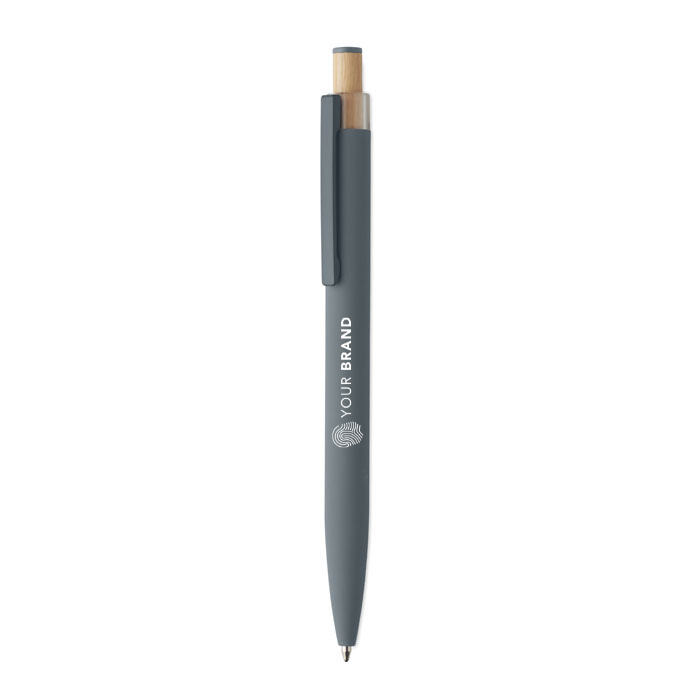 Recycled aluminium push ball pen with bamboo button with matching colour detail and matching metal clip. Blue ink.