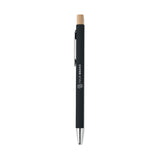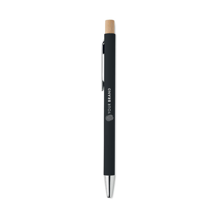 Recycled push aluminum button ball pen. Silver tip and clip. Laser engraving only. Blue ink.